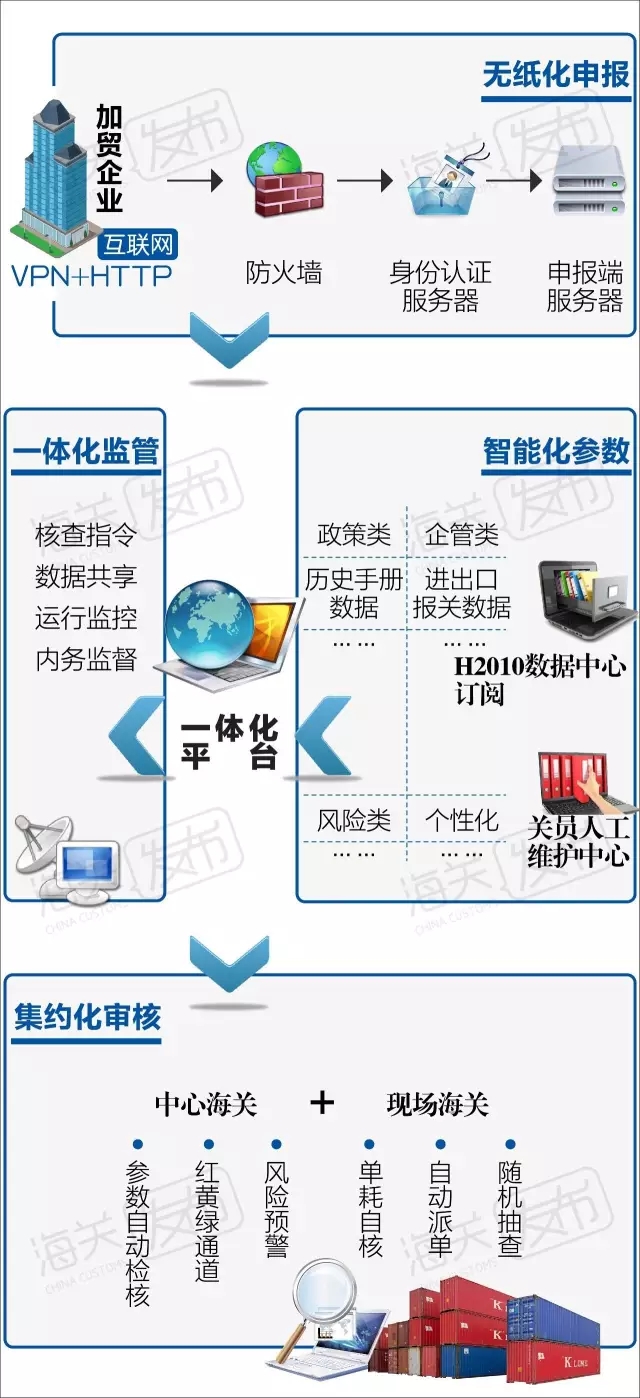 通過(guò)內(nèi)部的流程再造,以信息化手段實(shí)現(xiàn)加工貿(mào)易海關(guān)執(zhí)法作業(yè)的無(wú)紙化,以集中管理、專(zhuān)業(yè)審核實(shí)現(xiàn)集約化,以完善風(fēng)險(xiǎn)參數(shù)實(shí)現(xiàn)運(yùn)行監(jiān)控的智能化,通過(guò)信息互聯(lián)互通,相關(guān)部門(mén)廣泛參與、錯(cuò)位監(jiān)管、協(xié)同施力,最終實(shí)現(xiàn)加工貿(mào)易監(jiān)管的一體化。